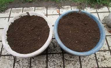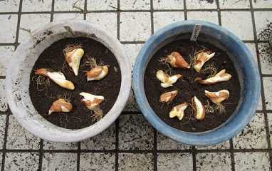 (昨年と同じく8号鉢に5球と8球の計13球植付け。)