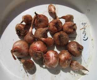 (植付け前のサフランの球根。4月に掘り上げた2年目のものである。)