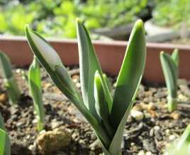 10月に球根を植えたミニチューリップ・テタテタが発芽した。