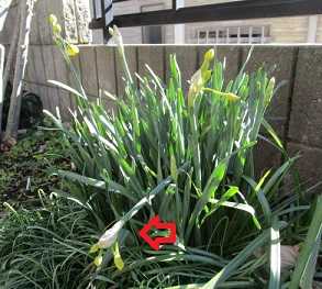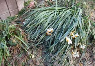(なお、雪により花茎が1本折れているので支柱とテープで修復した。)