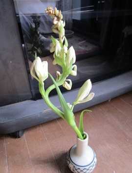(花びんのチューベローズの花穂が咲かないまましおれてきた。)