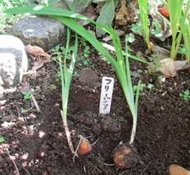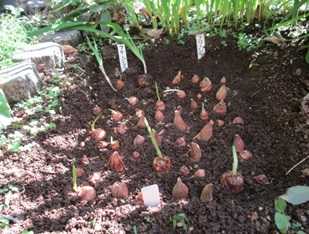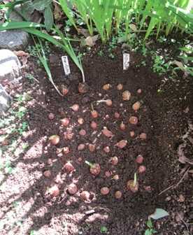(掘り上げそこなってだいぶ伸びている球根が2球あったので一緒に再植付け。)