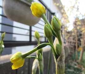 (黄水仙の蕾が開き始めた。)