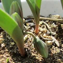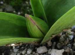 (鉢植えクロッカスは蕾の薄皮がむけるのに時間がかかっている。)