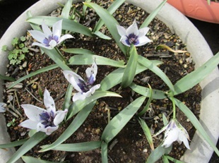 (ミニチューリップ・アルバの鉢。8号鉢に小さいのも含めて21球植えてある。)