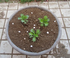 (ヘレネの鉢。7号鉢に小さいのを含めて15球植えてある。)
