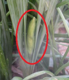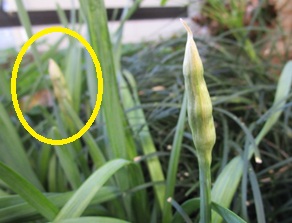 (日本水仙の蕾。最初に見つけてモニターしていた蕾(黄〇)とは別の蕾(右側)が伸びてきた。)