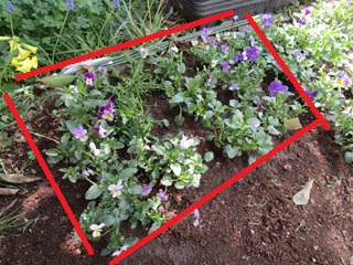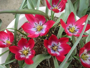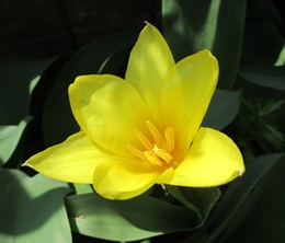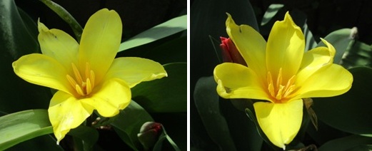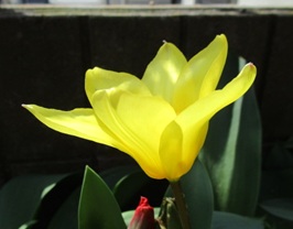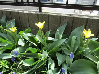 (地植えチューリップ。まずは黄色が3輪開花した。)