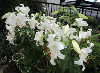 (オリエンタルリリー・カサブランカの鉢。8号深鉢に3球ずつ計6球植えてある。)