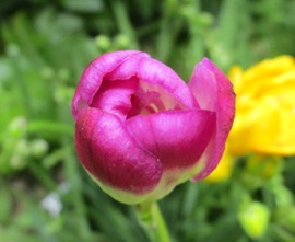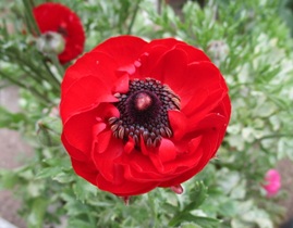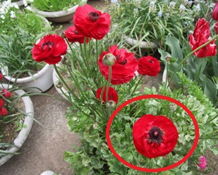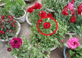 (ラナンキュラスの4株目が開花したが、背後の最初に咲いた赤と同じ色だった。)