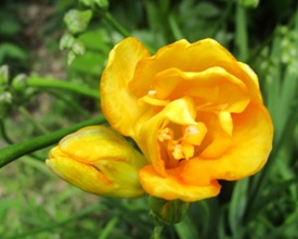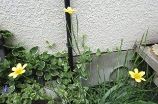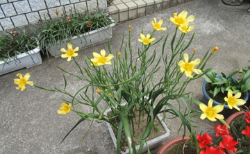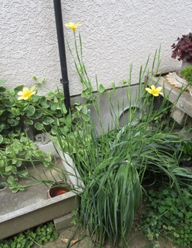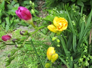 (フリージア。地植えにしており、まず黄色が開花した。)