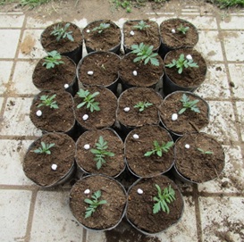 (マリーゴールドの残り18株をポット上げした。)