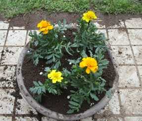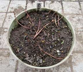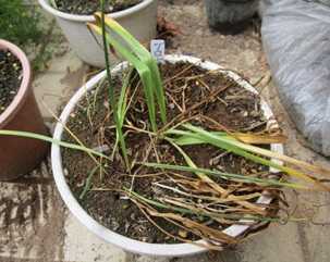 (掘り上げ前の紫のクロッカスの鉢。15球植えてあった。)