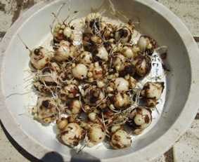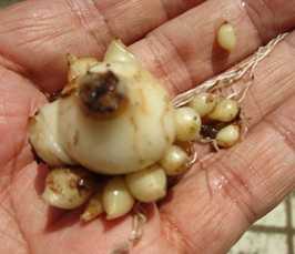 この球根は室内で陰干し保存して秋に再植付けする予定である。