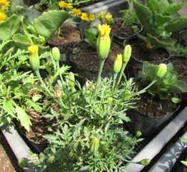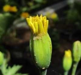 (マリーゴールドの最後の65号がようやく開きそうだ。)