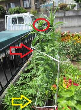 (なお、背丈がだいぶ高くなってるので、既に赤のグロリオサと同じ高さの支柱(黄色⇒)を立てていたが新たに高い支柱(赤⇒)を立てた。)