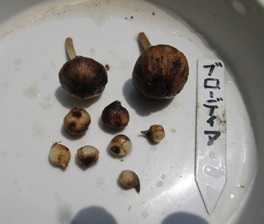 (掘り上げた球根。親球2球の他に子球が7球ある。)