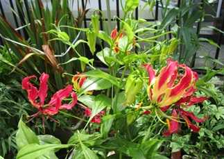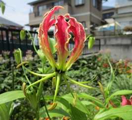 (あずき色のグロリオサ。右下の赤のグロリオサより背丈がだいぶ高い。)