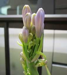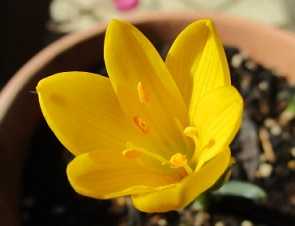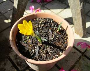2021年秋に植付け前の保存中のヒヤシンスの球根の中に蕾が出てきたものがあったので、隣に植えてあったステルンベルギアの球根が1球紛れ込んでいたものと気付き、その1球を5号鉢に植えたものである。