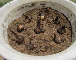 この球根は室内で陰干し保存して秋に再植付けする予定である。