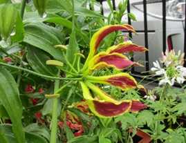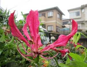 (あずき色のグロリオサ。風で横向いている。)