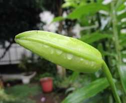 (ヒメノカリスの蕾。雨の中だが今夜咲きそうだ。)