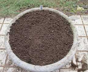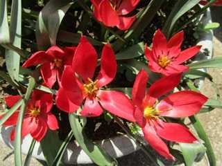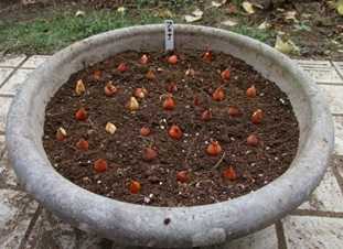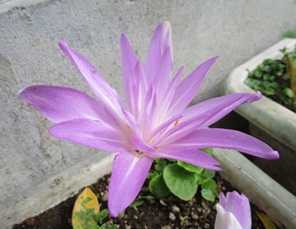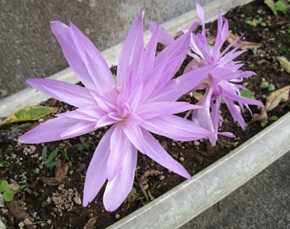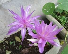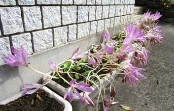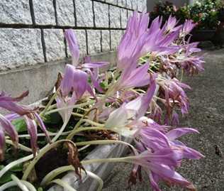 (八重コルチカム。標準プランターに14球植えてある。緑の葉はこぼれ種ベゴニアなどである。)