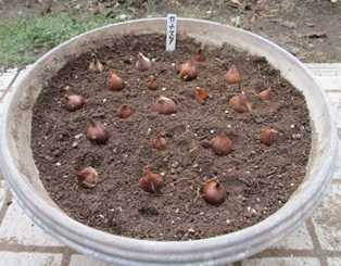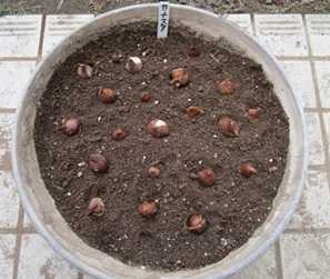 (円形プランターに小さいのを含めて20球植付け。)