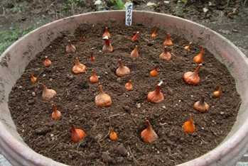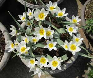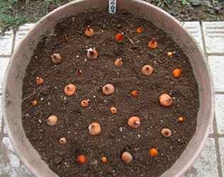 (円形プランターに小さいのも含めて全30球植付け。ちなみに昨年は20球だった。)