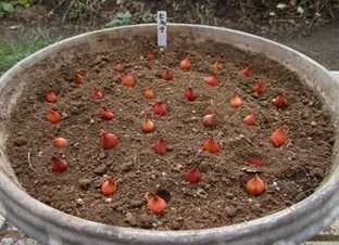 (昨年と同じく円形プランターに約30球植付け。)