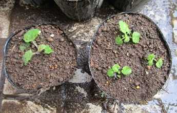 (こぼれ種マラコイデスの今シーズンの初ポット上げ。)