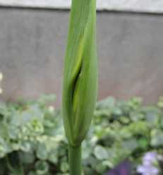 (地植えの黄色のリコリスの蕾。薄皮がむけてきた。)