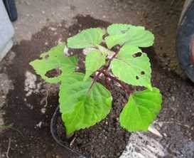 (こぼれ種のサルビア。開花は来年の見込みであり室内で冬越しをさせるつもりである。)