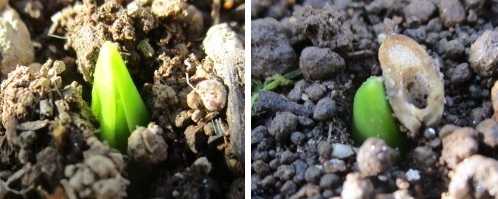 (アラビカム。正方形プランターに6球うえたうち2球が発芽した。)