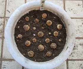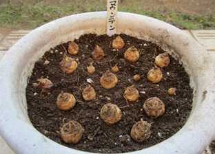 (7号鉢に小さいのも含めて20球植付け。昨年も20球だった。)