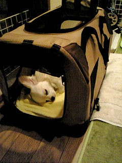 久しぶりに玄関の廊下に置いたお出かけ用のクレートが気に入った翔です。