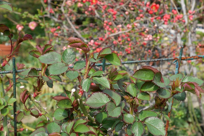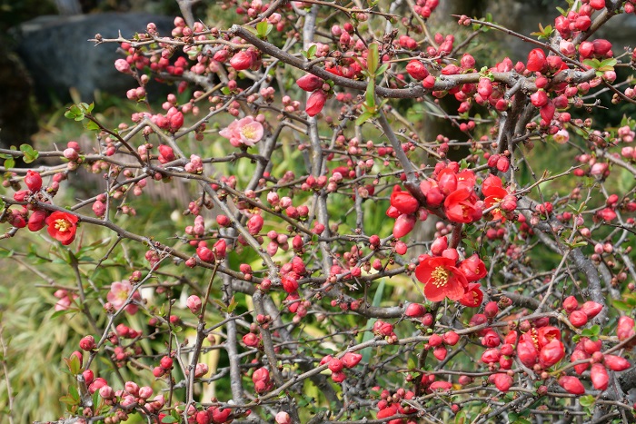 ピンクと赤の咲く 木瓜