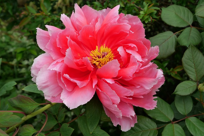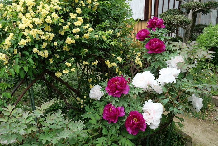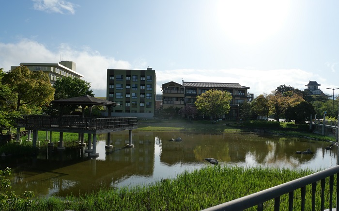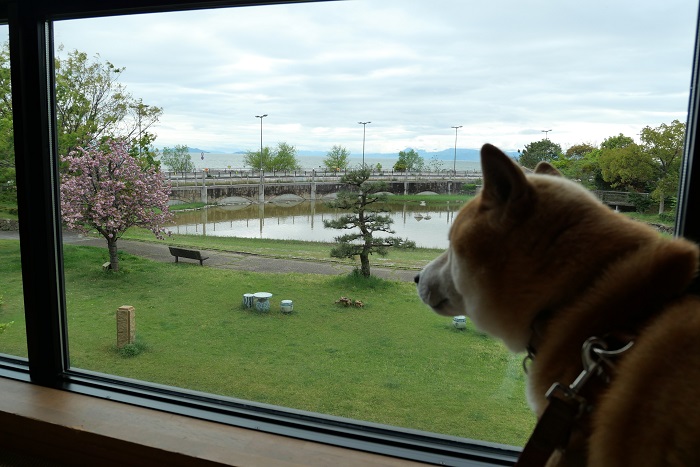 お庭と池と琵琶湖、咲いてる花は八重桜~