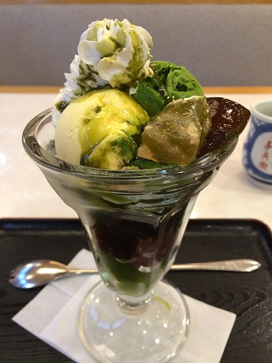抹茶とほうじ茶の和風パフェ 💛 380kcal ¥480 昨日は、早朝より13時半すぎまで、父とお付き合い。 外出支度、通院、買い物、お昼ご飯、貰った薬の仕分け、とパタパタパタ。 お洗濯モノはもう、ウチに持って帰ってしてくることにしました。 父はちょっとでも洗濯機にエラーが起きると、 私がまだ世田谷に居た頃からでも、 すぐパニくってワァワァと電話してくるので、もう、ウンザリ! 今度は近くなったし、たいした量でもないのでウチでやるわ。 昨日、用事全部済ませて父の家をでてから、 とにかくどこかで一息いれたくて、 そして、くたびれている我が身に甘味を許したく、華屋与兵衛に寄り道。 食べちゃったもんね~~~~、「 抹茶とほうじ茶の和風パフェ」 抹茶ゼリー、小豆餡、生クリームの層の上に、 抹茶わらび餅、わらび餅、抹茶アイス、バニラアイス、ほうじ茶ゼリー、生クリーム、 というトッピング♪♪ こういうもの、たまにはむさぼり喰わなきゃ、やってらんないわって!!! (;^ω^) オイチカッタどぉ~~~~\(^o^)/ さて、とぉ・・・・ 今日は、車検に渋谷の神泉町まで、モエドラ君と出かけてきます~~~~🚘 彼はまだ、運転、不如意なので私がアッシーちゃんです。