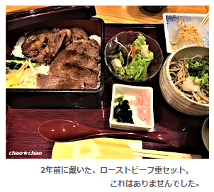 以前、ここで「ローストビーフ重とお蕎麦のセット」というのを食べていて