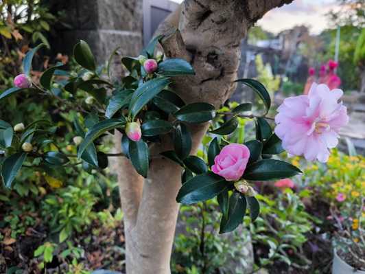 山茶花の最初の花が咲いた。乙女山茶花。ツワブキ100円で買ったサボテンを外に出した…