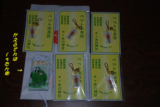 金曜日の避妊手術を前に強い味方が届きました分のお守りと無事に手術が終わってちゃんとお家に帰ってくるようにかえるの、お守りをお友達が送ってくださったんですほね型のお守りはそれぞれのリードへ装着完了かえるちゃんは当日くぅに持たせますねにゃんちゃん大変な時に本当にどうもありがとう金曜日がんばってくるからねよくお友達ブログでも見かけてて欲しいなぁと思っていたもの・・chibiz用のちゃんちゃんこなのですがアチコチ検索してやっと コレという物を見つけました旧型の物だとプライスダウンしててお買い得3S、DS、MD二着、7Lが欲しかったのですが・・・小次郎の7Lは作られてなくてちょっと残念その代わり小次郎にTシャツを選びましたこれも値段の割りに生地がしっかりしててお買い得の一品でしたちゃんちゃんこは気に入った柄が昨年デザインの物で3S DS MDそれぞれの在庫が最後の一着MDは新旧デザインで各一着ずつくぅが着てるのが2009年デザインの物ですと言っても生地の柄が違うだけ体は細いけど胴がさつきよりチョッピリ長いくぅたんにMDサイズピッタリでした空っちは胸周りが太いけど胴の長さはくぅとほぼ同じ胸元を紐で結ぶのではるひ以外は兼用もですくぅの着てるMDサイズ以外全部青なんだけど暖かく過ごせればいいよねこのお店発送に関して希望があったら書き添えてください とあったのでなるべく早く欲しいので出来たら木曜日までにお届けしてくださいと書いたらなんと、なんと今日の午前中に届きました在庫があればということでしたがまさかこんなに早く送ってくれるとは金曜日に向け心でカウントダウンが始まり内心ドキドキ過ごしてるくまこですが昨日と今日でちょっとハッピー気分になれました
