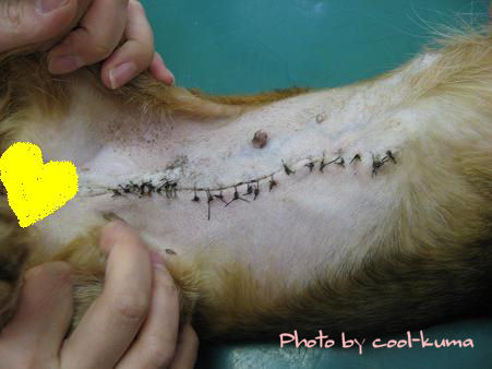 たくさんのお友達からパワーを送っていただき本当にありがとうございました手術は無事終わりましたが傷口を縫う針の穴から出る血が少し止まりにくいとのこと自宅に戻っても差し支えはないようなんだけど犬種がダックスということとchibizは兄妹が多い大事をとって今日一日入院することになりました「麻酔をかけ始める」と病院から電話をもらいかけつけたのが12時10分ころその後程なく麻酔でボーっとしたくぅをお兄ちゃん先生が抱きかかえて手術室へ全部で40分くらいかかると聞いてたのですが子宮と乳腺腫瘍を摘出して縫合し終わったのは1時間とちょっと経過していましたその後わきの下の脂肪の塊を取るのにコリコリがある場所の確認でくぅのいる手術室へ何度も手術には立ち会ったことがあるものの麻酔がかかりピクリともしないくぅを見るのは正直辛かった・・・皮膚の上から触ると結構大きく感じたしこりも切除された物を見ると小さな脂肪の塊でした全ての処置が終わり切除した子宮と第3・4番の乳腺を見せてもらいましたが子宮はちょっと膨れてきていていい時に取れてよかったとのこと乳腺の部分は幅2センチ長さ10センチほど切り取られていました ここをそのまま縫うと開く圧がかかるから 内部をシワを寄せ幅を縮めて一度縫った後に皮膚を引っ張り縫合したそうです 一度に3箇所も切っちゃったんだもんね マミィは想像しただけで痛いよ・・・ ゴメンよ くぅちゃん 手術を決めた翌週に病院へ診察に行った時お兄ちゃん先生はお母さん(くまこ)大丈夫ですか?ぼくがちょっと強引に手術を決めてしまったから落ち込んでいませんか?と心配しておられたとか・・・見た目に元気だとリスクの大きな手術ってなかなか踏ん切りがつかなくて決めるまでに長い時間を要してしまいましただから結果的に本当に良い導きをしてくださったと思っていますそれにこのお兄ちゃん先生も小さな子はかわいそうで注射もしたくないんだとか本当に親子でに優しい良い先生達です手術が終わりましたと言われて程なく奥の方からピィピィとくぅの泣き声が聞こえてきました麻酔の醒めるのが早かったように感じます閉じていた目が開きボーっとした顔ではあったけどみんなでくぅに声をかけナデナデして帰ってきましたくぅたん 明日の夕方にお迎えに行くからね今日の金曜日のばら元気玉をくぅたんへ贈ります・・・そしてパワーを送ってくださったお友達のみなさま本当にどうもありがとうございました