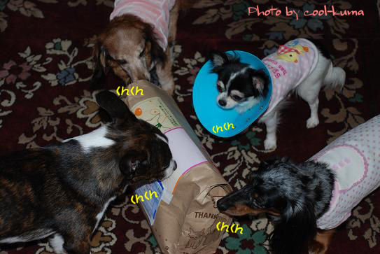 またまたご無沙汰してしまいました現在はすっかり良くなりピョコピョコ飛んだりもするようになってきましたがさつきが手術を受けた翌週水曜日あたりからくしゃみのような咳のようなのが出始め診察してもらい薬をもらいました免疫力が落ちていて口の雑菌が鼻に回ったのかもという診断だったのでさつきは菌に効く薬を処方してもらったのですが・・・この後ちびず全員おんなじような症状が逆しゃっくりのようにブヒブヒするやいつもと違う舌なめずり+鼻を降る鼻から息をフンー フンーと力を入れて噴出すようにする鼻水がタラリンと垂れてクシュクシュするさつきを診てもらった時に先生に話しはしてみたのですが・・・食欲があって元気だったら全然問題ないですとあまり問題視?してもらえず仕方がないので日を改めてちびパパとちび姉とで病院に行ってもらいビデオに撮ったものを見てもらいお薬をいただきました花粉症の薬と同じ作用のものですアレルゲンをブロックする薬だそうで5日分をいただき症状が落ち着きました薬漬けにしたいのではなく症状の軽いうちに治したいと思う気持ちだったんですけどねくぅとさつきの手術前のくまこの過剰反応?が先生には大げさな反応に感じさせる要因になったんだろうか説明しようにも難しいものはビデオを撮って見てもらうのがいいですねchibizとくまこの体調はちょっと低迷してましたがクリスマス前にうれしいお届け物がありました毎度においチェックをする子ら先月寒さ対策にちゃんちゃんこを買ったのですが小次郎用の大きなサイズが売ってなくて・・・それを見たさんごりさんが実家とさんごりさんちのに作って生地が余るからと作ってくださいましたどう どう小次郎とってもうれしそうでしょとっても分かりやすい子達こんな良い顔はなかなかしません紹介するのが遅くなっちゃってごめんね~しっかり愛用させてもらってますよさんごりさん本当にどうもありがとう今年もあとわずか来週の金曜日のばらは元旦ですね気持ちが落ちて日記が書けなかったり休んでしまったことも多い年でしたが細く長く来年もまた続けられたらいいなぁと思っています本日で2009年の日記UPはお終の予定こんだけずる休みしてたのに年賀状も書けてないし大掃除もまだまだ手もつけて無くって・・・ ホントどうしましょういつも遊びに来てくださるお友達のみなさま良い年をお迎えくださいね来年もどうぞchibiz一家を宜しくお願いいたします
