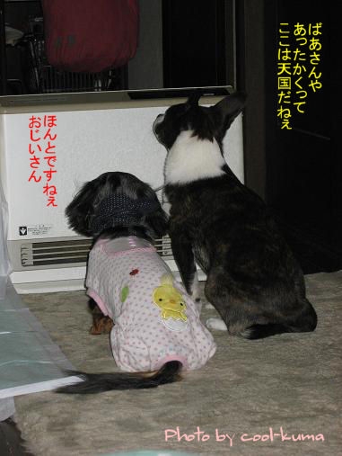 寒い日が続きますネchibiz家のリビングではストーブをつけると必ずこんな光景が ・・・・・・・な~んて会話は無いと思うけどこんな姿を見ながら後ろ向きに座ったら目もショボショボしなくていいんじゃぁないかなぁ・・・と温かさに眠気が襲ってきたのかなくぅ寝ちゃいましたお腹に鼻を突っ込まれちょっと困惑気味の空っち久しぶりの動画ですこんな風にごはんを食べています ココをクリックしてねみんな一緒にいっただきま~す posted by (C)kumako