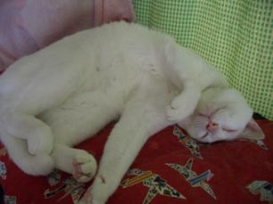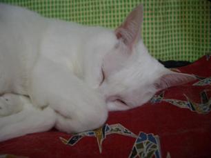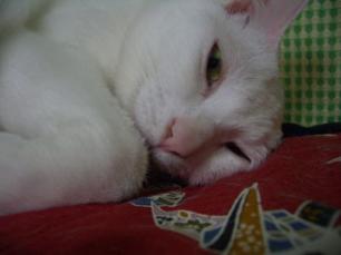 梅雨空が戻ってきました。雨が降っているので窓を開けることが出来ず、寝苦しい夜でした。エアコンをつけるにはまだ少し早いし、 今夜から扇風機で空気を循環させようかしら。とにかく暑いのが苦手な私・・。それでも夏痩せしたことないんですよ。どんなに暑くても食欲だけは落ちません。チビも私に似て、最近良く食べてます。二人で夏太りしないように気をつけなくちゃ。 彼の勤務体制が変わり、夜勤の時は夜中の3時頃帰ってきます。私は寝る前に彼の夕飯の支度をしてから眠るので、起きていきません。チビは彼が帰ると起きていって彼と遊んだり、 起きないでそのまま私と一緒に眠ったままだったりします。チビの気の向くままに・・。朝、目が覚めた時、チビは足元で寝ていました。『珍しく昨日は起きていかなかったのね』そう思っていたら、彼が帰宅した時、起きたそうです。そして暫くスリスリして甘えて、また私の布団に戻ってきたのだとか・・。彼にも私にも、甘えたり、そばにいたりしたいみたいです。チビなりに気を使ってるのかな。午前中、買い物に出かけ、家に帰ると、今日もチビは半纏の上でお昼寝していました。買い物を冷蔵庫にしまい、そっと近づいてみました。今日もまたもや、気づいてない様子・・。そっとカメラを用意して、忍び足で近づくと・・やっぱり!そ~っと写真を撮ろうと近づいたら・・!『ン?ニャ・・』 『またアタシの寝顔、撮ろうとしてたニャン?勝手に撮ると、お仕置きだニャン!』チビ、ストラップ、放してよぉ『ググ・・絶対放さないんだニャン』 『あっ、逃げちゃったニャン』 『今度は起こさないでニャン』チビ、足を抱きかかえて体操してるみたいだよ(笑) 事情により、楽天会員以外の書き込みを停止しています。楽天以外の方はこちらの掲示板をご利用ください。日記の右側にスクロールバーがついていますスライドさせながら日記を読んでくださいね♪ブログランキングに参加していますチビをポチッとクリックして 応援よろしくお願いします☆