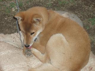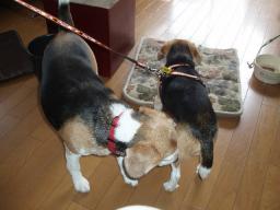 私達がご飯を食べている時にチコはよく癲癇をおこします今日もそうでした一番最初になった時はもうパニック夜の11時ごろ。。主人が遅く帰宅してご飯を食べてたときにもう苦しそうに口を開けてグアグアってそのまま後ろにひっくりかえって泡ふいて何がなんだかわからずとっさに思い出したのはその日の夕方ケン○ッキーのフライドチキンをくわえていってほぼ丸呑みしたことを・・よく早食いして戻すことがあったのでチキンがもどってきて喉につかえたと思ったのです主人にそれを言うとチコの背中をたたいたりゆさぶったり・・私も口の中に手を入れて骨を探したり今思えばわらっちゃいますがチコの苦しいときにねぇそれから今日までもう20回はおこしてます薬のおかげで4~5分ぐらいで、おしっこを漏らすこともなくなりました。1日2.5錠飲んでますビーグルは食い意地がはってるからかいつもご飯時です、いつもおやつをあげてるのですがダイエットさせたいし、ほんの少しづつあげてたらひっくりかえっちやいました癲癇の後は全然普通でなんかたべるものは・・っと探してる子で母がいつもそのたびにヒヤッとしてるのも知らず分からず気にも掛けずしょうがないですよねぇそういう病気だからだからますます盗み食いしてもひとの手からシュークリームをとっていっても怒れないしかわいいのです。 最近モミジもいい味だしてきました散歩中チコを噛もうとしたのでダメ!とおこったら私の顔をチラっと見てやめましただんだんわかってきたみたいですひどいかっこうで何をそんなにいそいでるの?って感じです。あなた本当に芝犬?