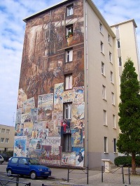 リヨンには「壁の絵」がたくさんあります。本屋にはその写真集もあるよ。 これらは「Musee Urbain Tony Garnier」の物で全部で25枚!トニー・ガルニエ(建築家)の都市計画を壁に表現した物やいくつかの国の特徴を生かした絵などあります。これらはトニー・ガルニエが亡くなって40年後(1988)に、ここに住む人達の提案で作られた物です。写真のように、全てアパートの壁に描かれています。さて、右の絵は一体、どこの国をイメージしたものでしょう?同じ質問をガイドのマダムからされて、コレだけはすぐにわからなかった私です。正解は「ロシア」この絵は他の絵と違い、まるで子供の絵本を見ているようでした。