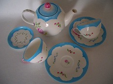 友達のために「ティーセット」を描きました。 一応、友達の希望を聞いて描いたけど… 期待通りになったかチョット心配…ブルーはいろいろあるけど、このブルーを使ったのは初めてでした。思ったより、綺麗な色に焼けてホッとしています…。昔、某紅茶のCMで「One for you, One for me, One for the POT !」 って言うの、ありましたよね~?あら?また年齢がバレバレ???あのCMを見てからは、ポットに紅茶を入れるときはそれをブツブツ…言いながら葉っぱを入れています。“紅茶が好き”という人は何となく、繊細で上品な感じがしますが、気のせいですか?ちなみに私はコーヒー派!繊細で上品な感じからは程遠いなぁ…。とにかく、この「ティーセット」をしっかり梱包して日本まで航空便で送ります。どうか…無事に着きますように…。