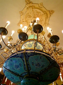 ルミエール兄弟といえば、映画を発明した人です。(エジソンやその助手も有名ですが)「美術館」には活動写真が生まれるまでのいろんなカメラがありました。彼らのお父さんはとても洒落ていて流行には敏感だったようで、リヨンに2台しか電話がなかった頃、それが市庁舎と彼らの家にあったそうです。持っている人が少ない中、どこにかけていたんだろう??? 「もしもし?」 「・・・」ガイドのムッシューが面白おかしく、説明してくれて楽しかったけど私は階段の天井からぶら下がっているシャンデリアが気になって仕方なく自由解散になってから、シャンデリアを探し、写真をパチリ! なんとも素敵な絵付けで、階段の手すりから身を乗り出して見とれていました。 ・・・うっとり~・・・お~っと、あぶないっ!どうやら、ルミエール兄弟は裕福な家庭で育ったようだ。